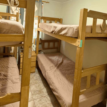 5 habitaciones : 3 camas matrimoniales + 2 habitación con 4 camarotes de 1 plaza y 1 habitación con 1 plaza adicional .
