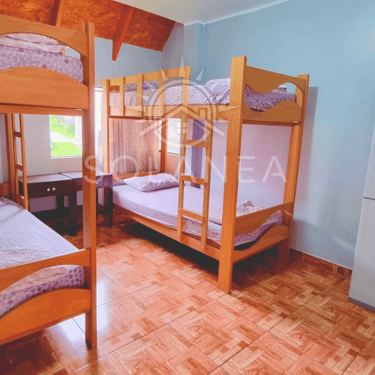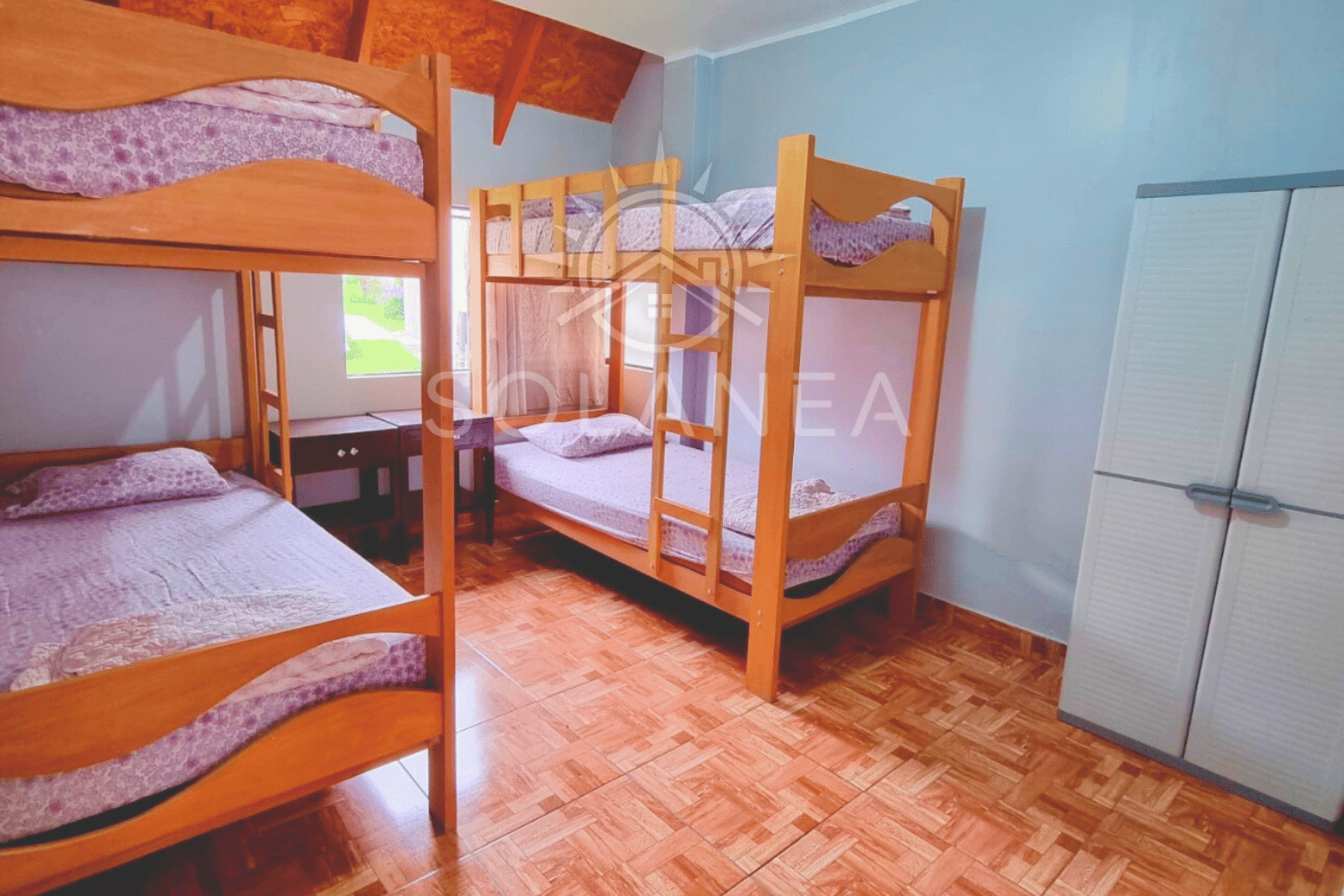 5 habitaciones : 3 Habitaciones matrimoniales + 1 habitación con 2 camas de plaza y media + 1 habitación con 2 camarotes de 1 plaza abajo y 1 plaza arriba.